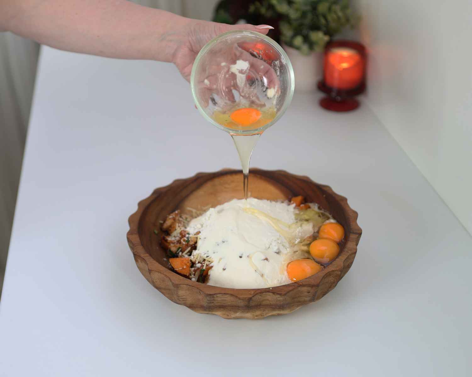 An image of the eggs being added to the mixture for the BBQ Chicken & Sweet Potato Muffins recipe