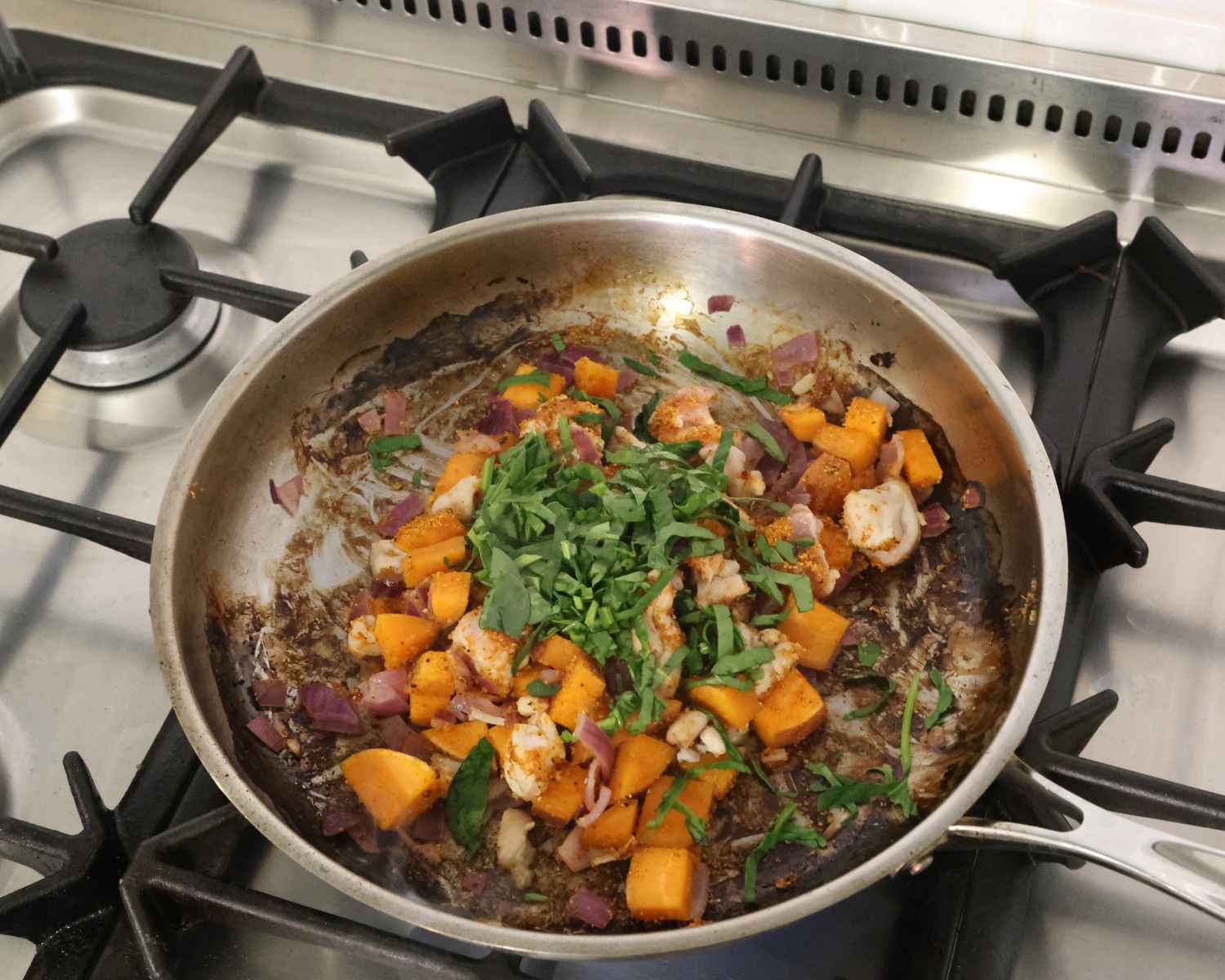 Diced sweet potato is being added to the heated pan for the BBQ Chicken & Sweet Potato Muffins recipe