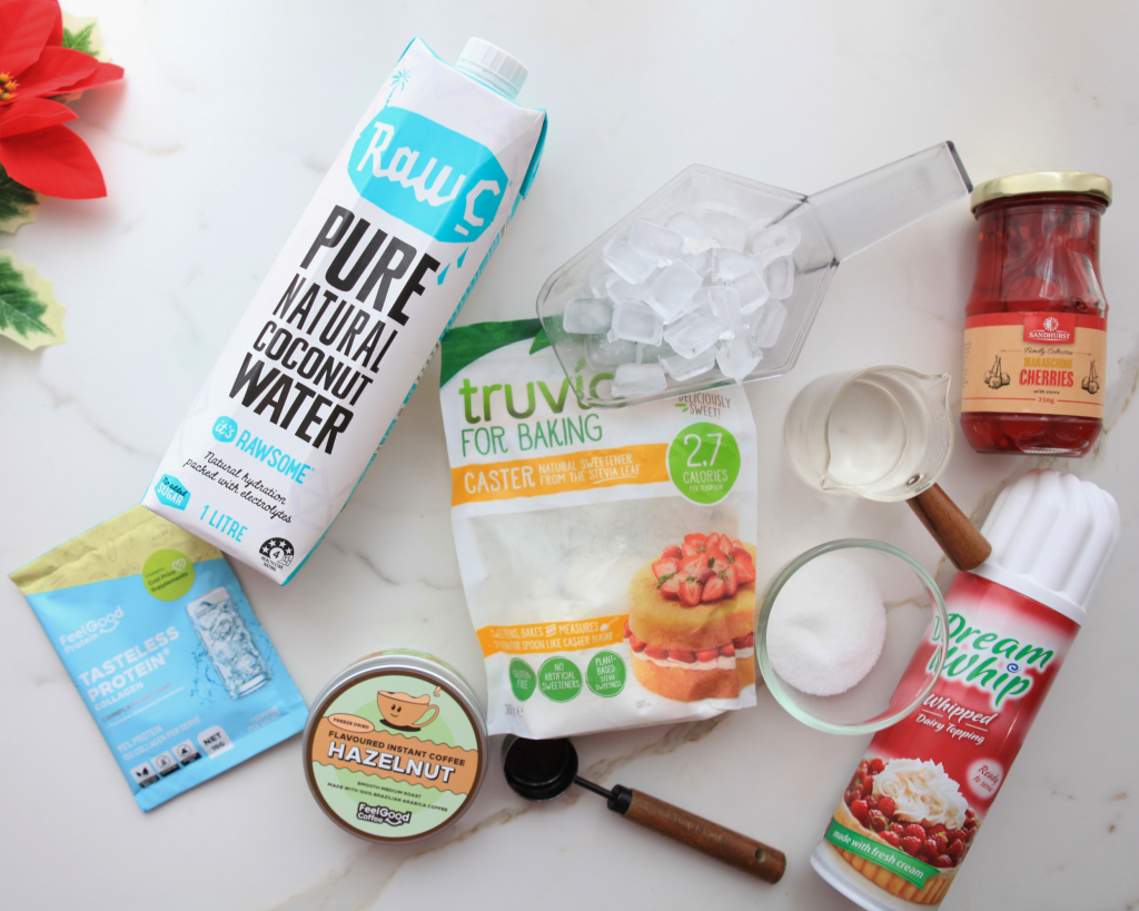 - Spoon the whipped hazelnut proffee foam over the coconut water and ice.