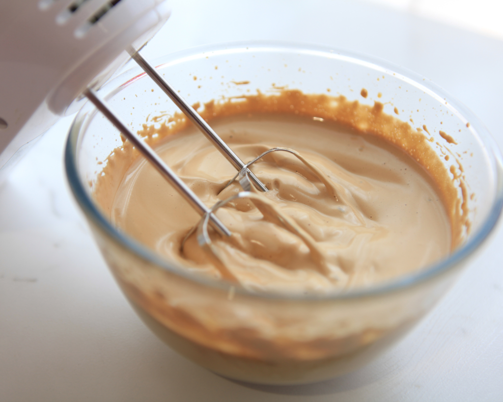 - Using an electric or hand mixer on low speed, whisk everything until the mixture turns light, fluffy, and glossy. It will change from dark to light brown and expand to about three times its original size. Set this aside.