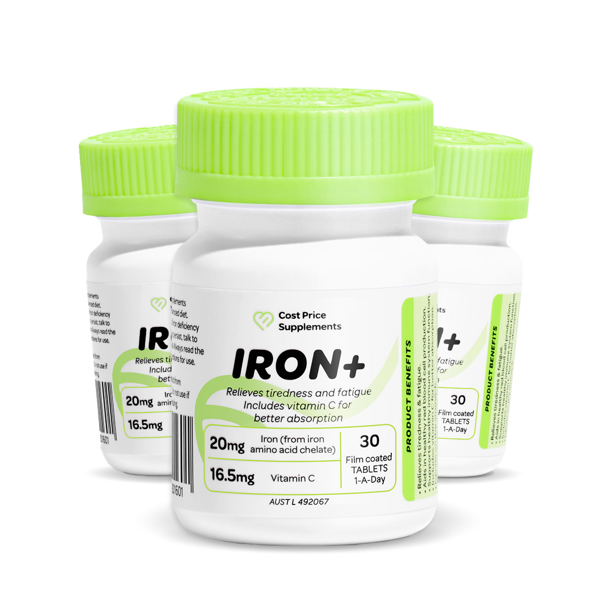 Iron+ by Cost Price Supplements is a high-quality, 1-a-day formula designed to support blood health, relieve tiredness and fatigue, and assist with healthy red blood cell production-key factors in maintaining an active and energised lifestyle.