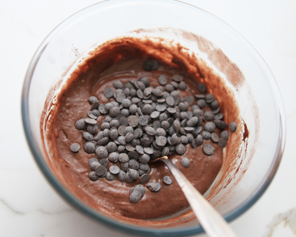 - To one bowl, add the cocoa powder and chocolate chips, mixing well to create the double-chocolate batter.