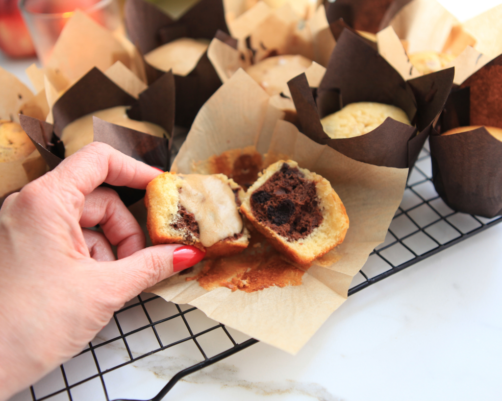 - Spoon a layer of vanilla batter into each muffin liner, followed by a layer of chocolate batter, then finish with another layer of vanilla batter to create a swirl effect.