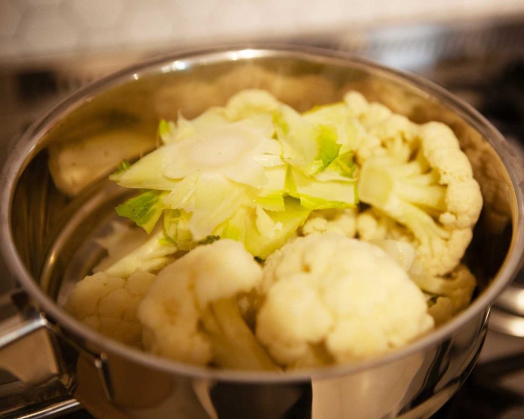 - Chop one head of cauliflower roughly, place it into a steamer, and allow it to steam on the stove until it is soft and mashed.