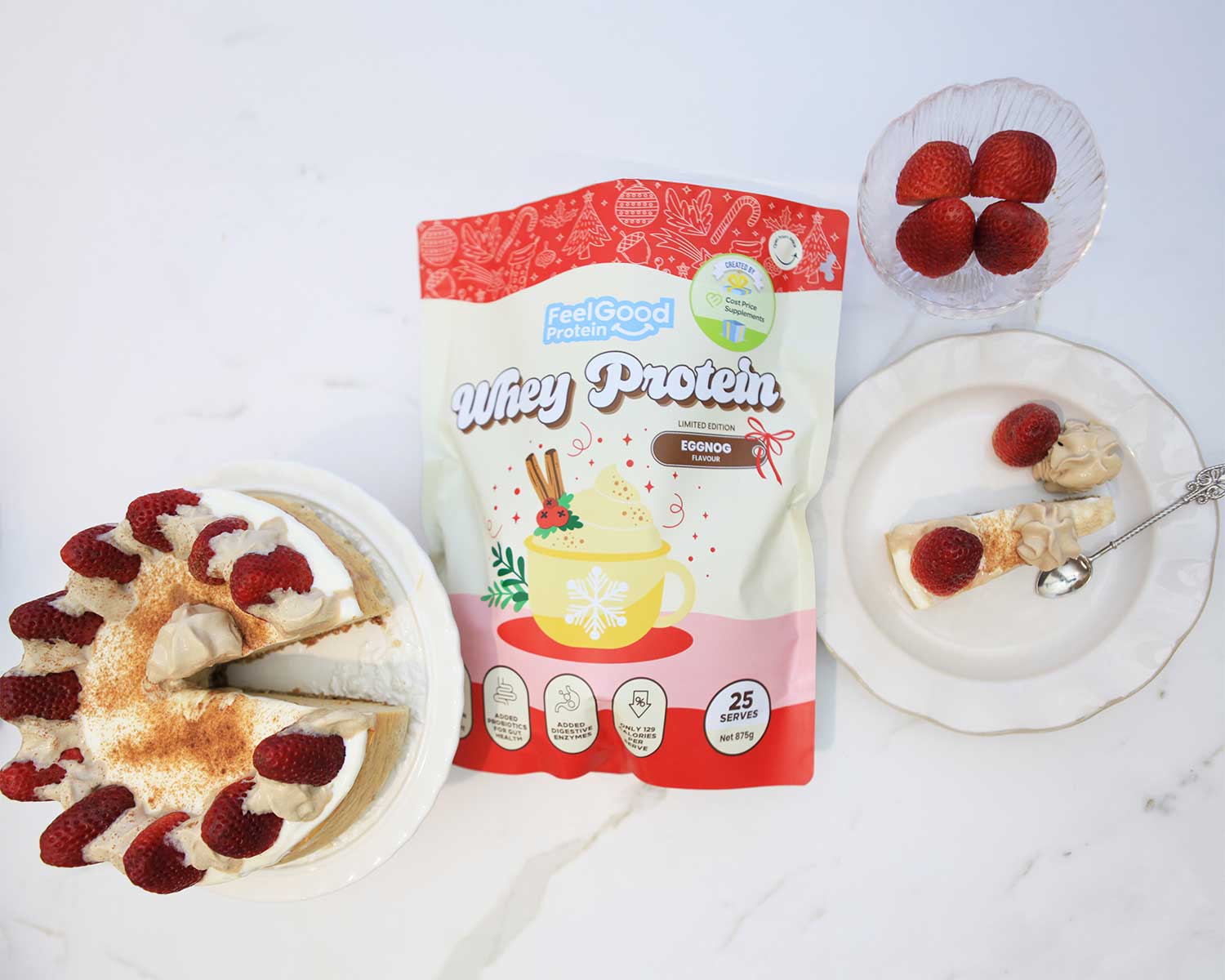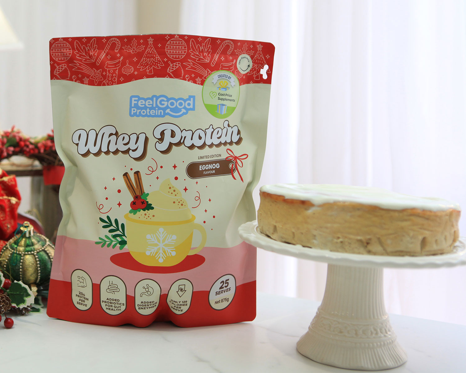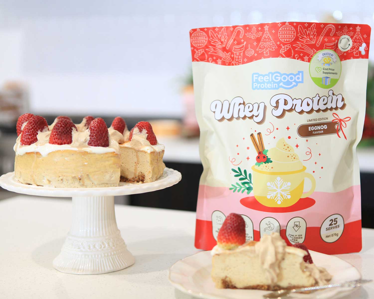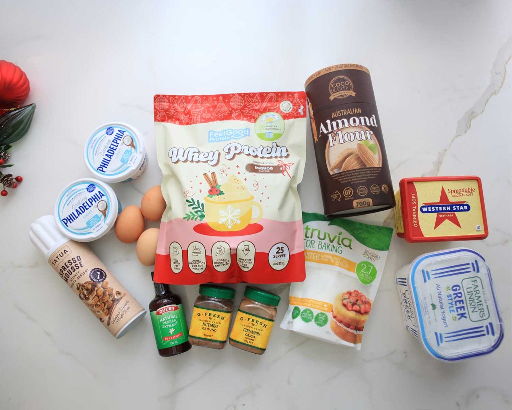 This low-carb, high-protein cheesecake is made with Whey Protein by Feel Good Protein in the limited-edition Eggnog flavour. Think creamy, spiced, festive goodness, without the sugar overload. Light, fluffy, and packed with protein, it’s the perfect way to enjoy a slice of Christmas magic while still staying on track with your goals.