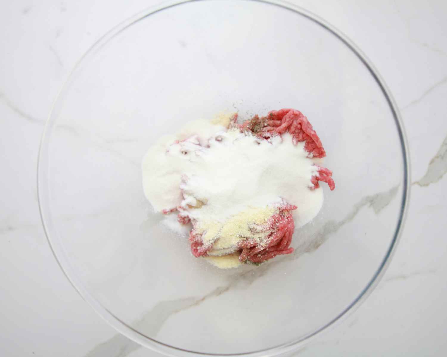 - In a large bowl, combine the mince, remaining 2 scoops of Tasteless Protein, dried herbs, paprika, garlic powder, parmesan, and black sesame oil. Mix well with clean hands or a fork until evenly combined.