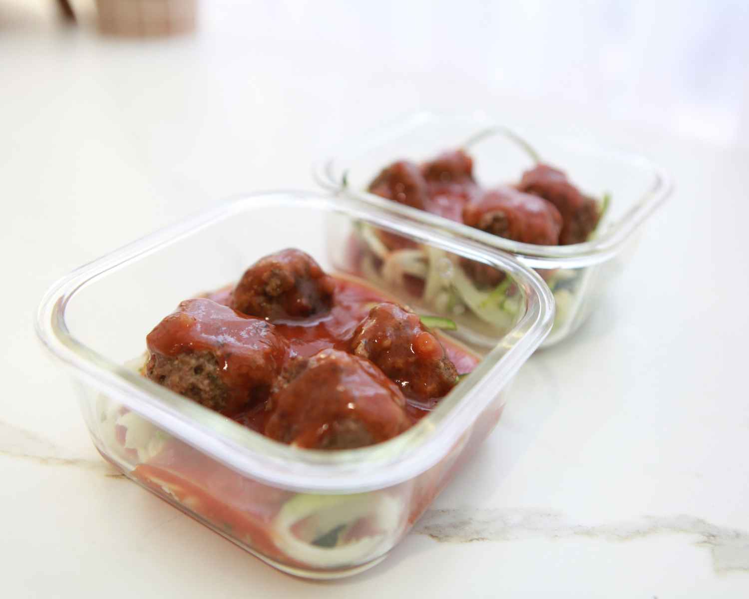 - Divide the zucchini noodles evenly between your meal prep containers. Top with meatballs, then spoon over the napolitana sauce. Sprinkle with grated cheese.