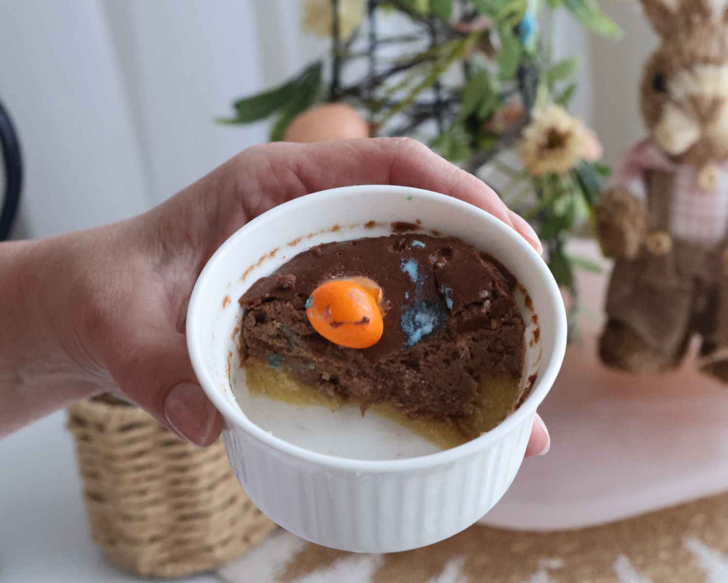 Adding M&M’s Peanut Milk Chocolate Speckled Easter Eggs to the cheesecake for the Mini Chocolate Protein Cheesecake recipe