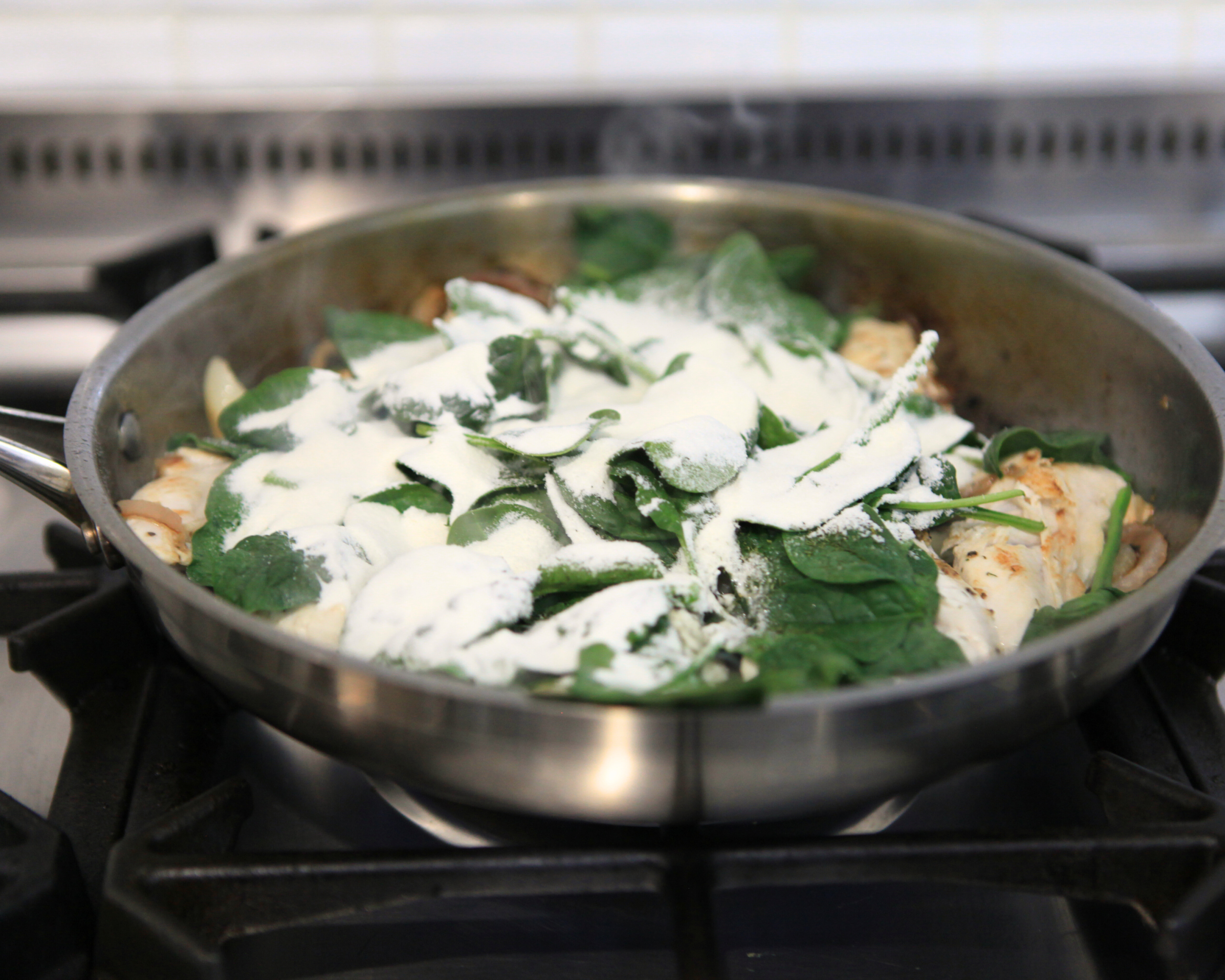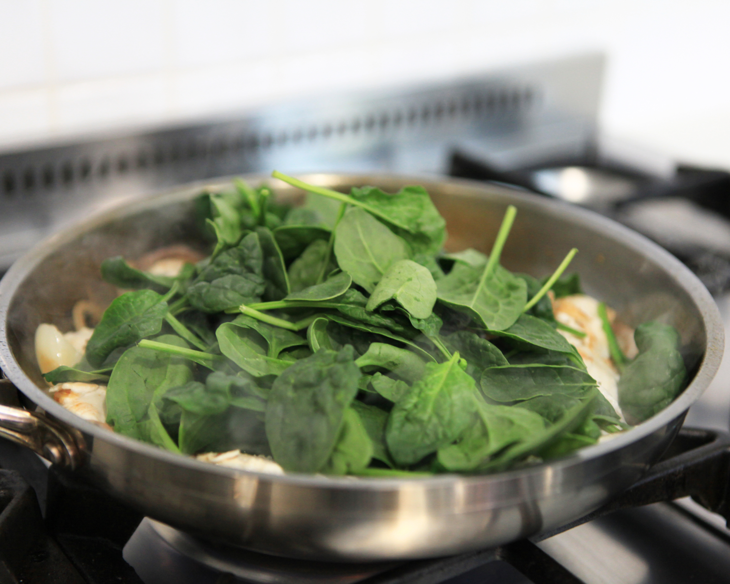 - Add the spinach to the pan, then sprinkle over the dried dill, tasteless protein powder, and ⅓ cup of water. Stir until the spinach wilts.