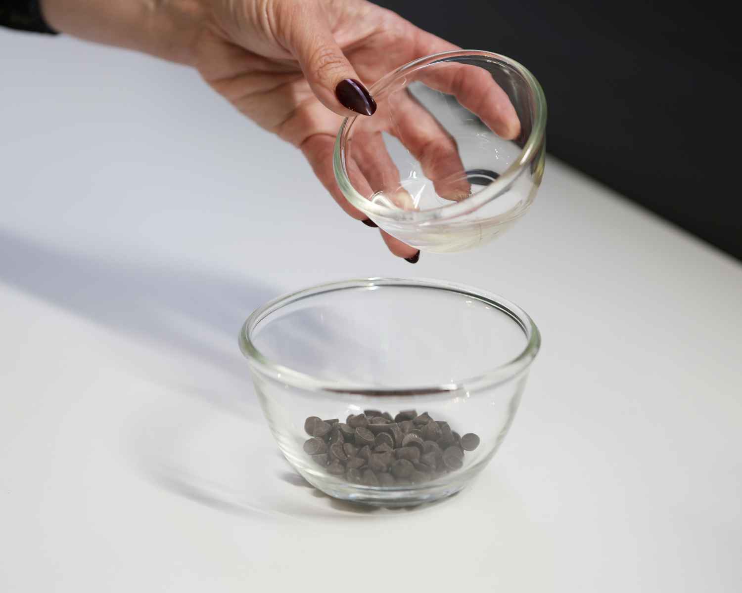 - Add the chocolate chips and coconut oil to a bowl. Microwave chocolate chips and coconut oil for 30 seconds.
