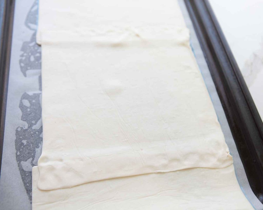 - Place three sheets of puff pastry end-to-end and gently press them together to form a long sheet.