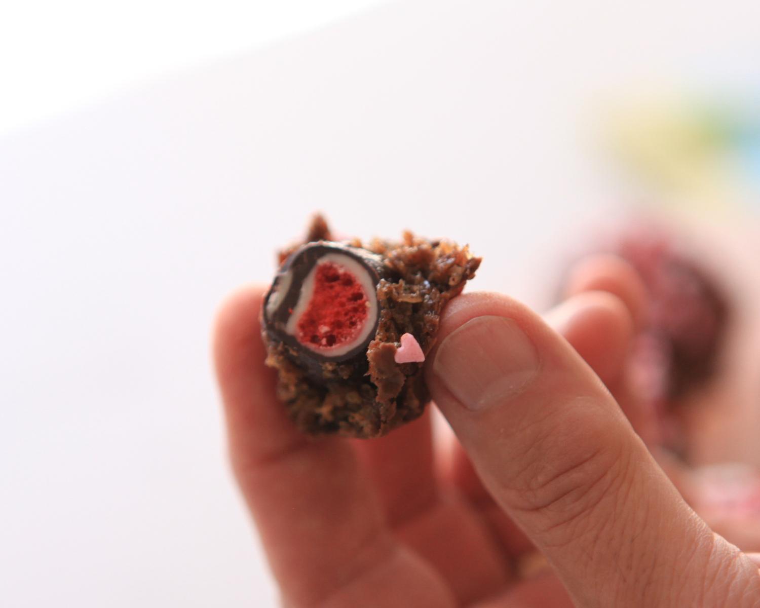 - Portion the mixture into 8 serves, then roll each portion into a ball and press a freeze-dried strawberry into the centre.