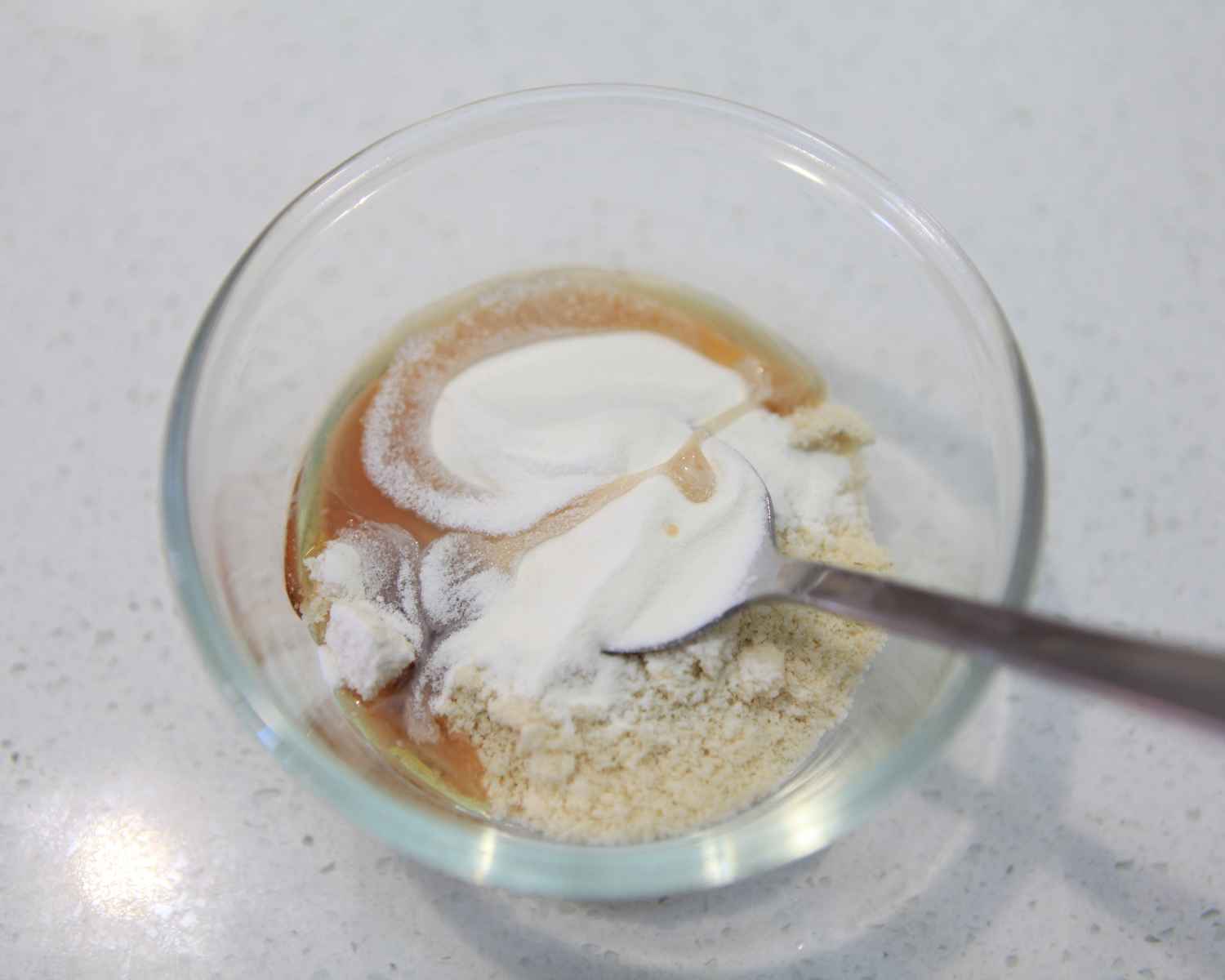 - Add the almond flour, tasteless protein, and sugar-free maple syrup to a bowl. Mix until combined and slightly crumbly.