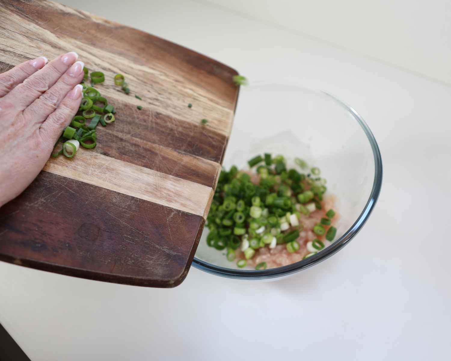 Viral dumpling bake green onion being added to the bowl with tasteless protein