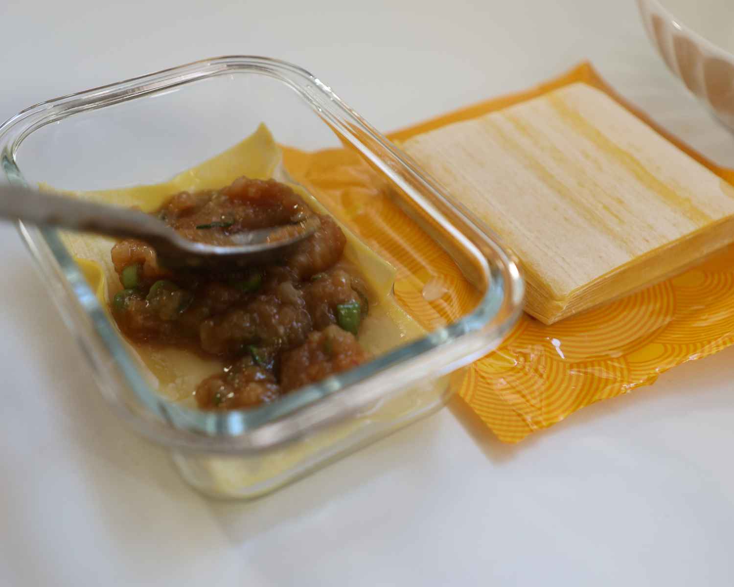 4. Repeat the layers of wonton wrappers and mince mixture until all the filling is used, finishing with a final layer of wonton wrappers on top.