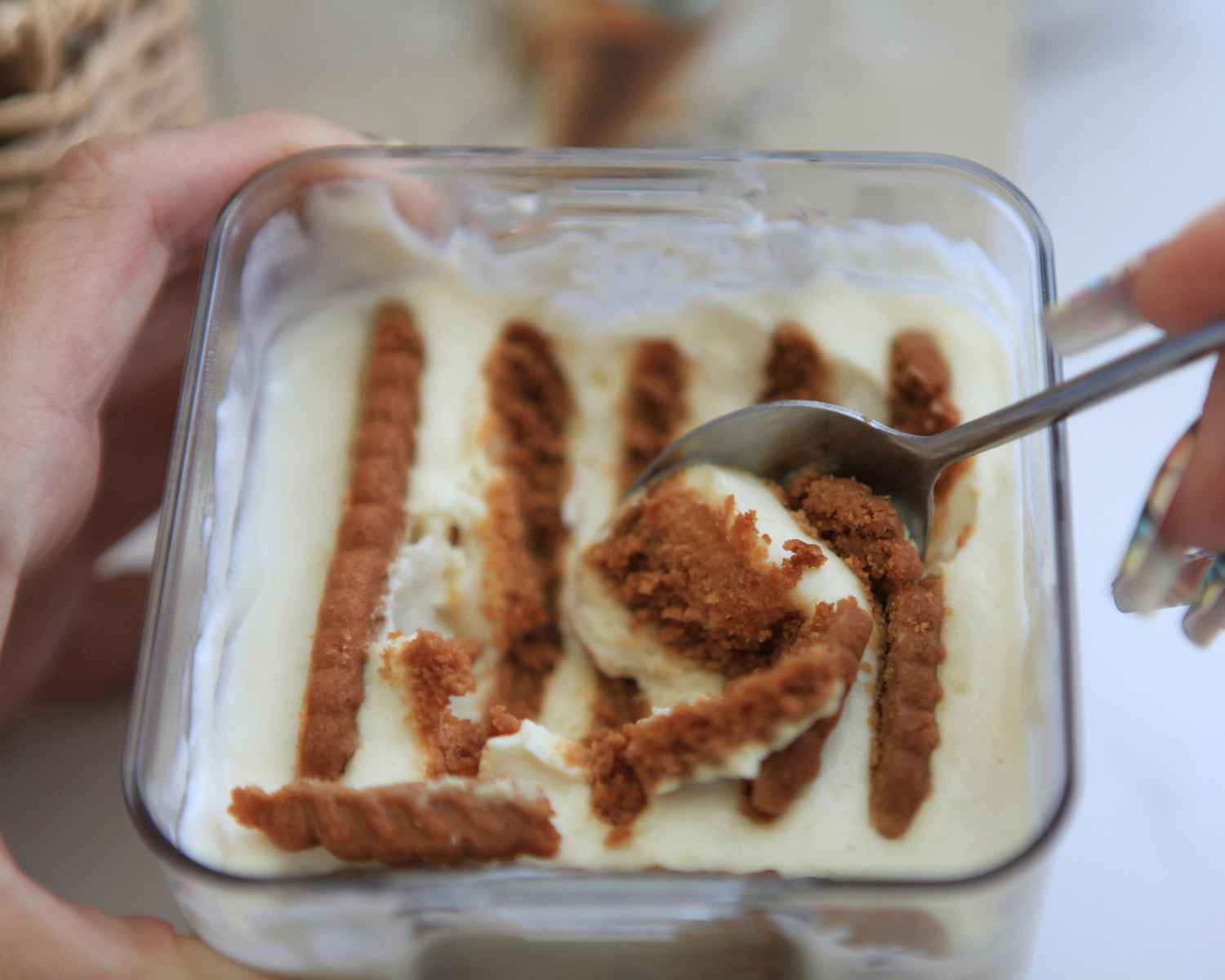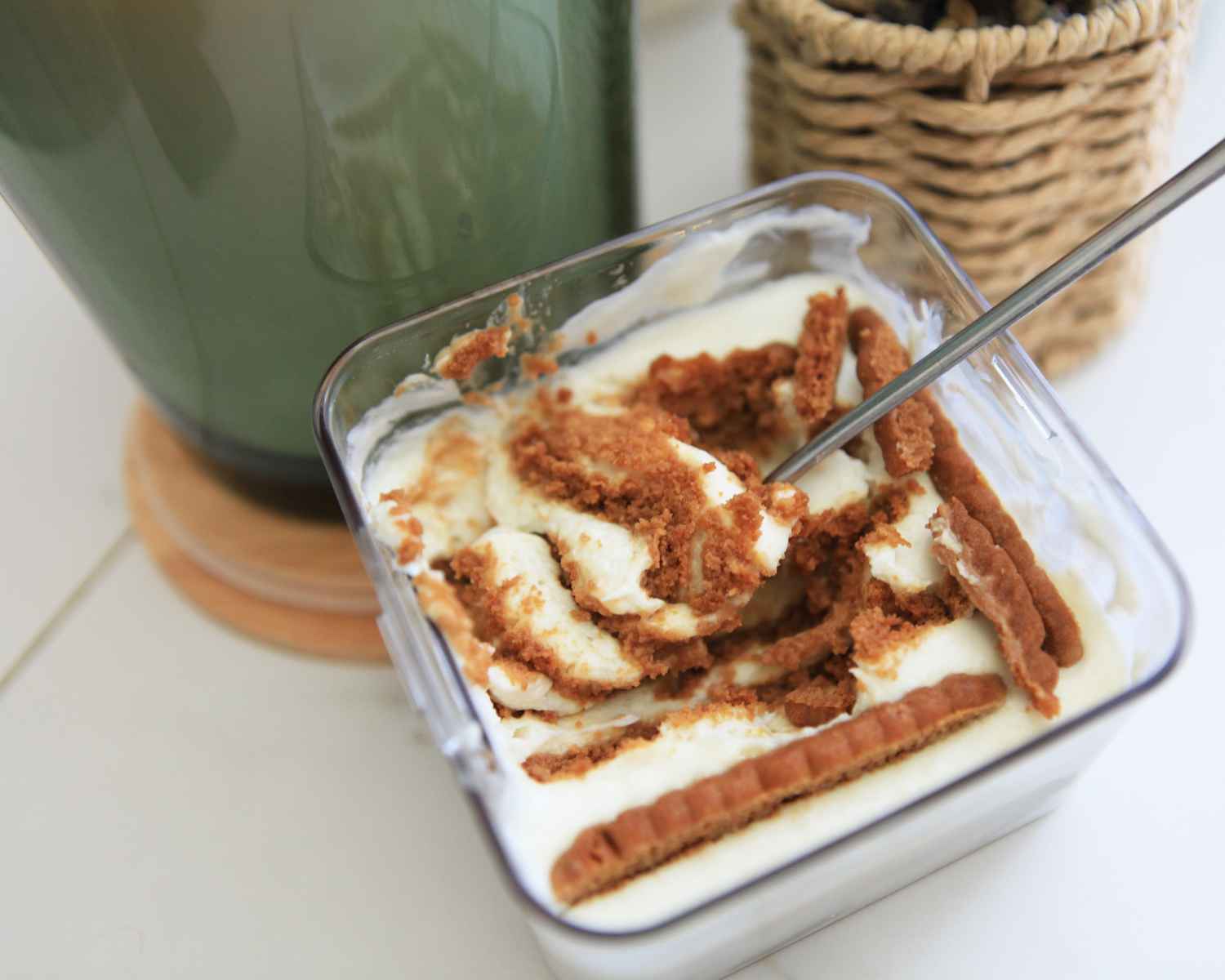 - Place the Biscoff biscuits lengthways into the yoghurt, gently pressing them down so they’re mostly submerged.